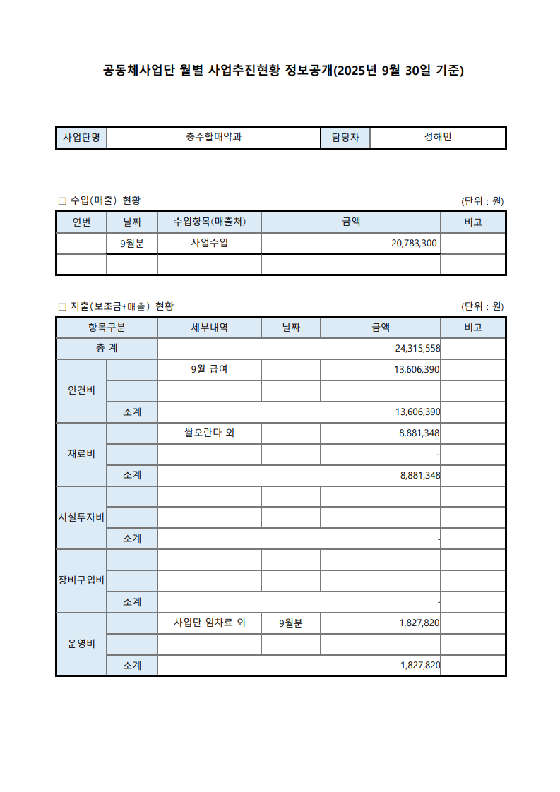 2025년 9월 공동체사업단(충주할매약과) 정보공개서