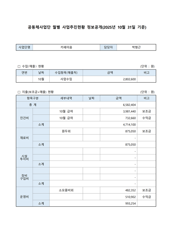 2025년 10월 공동체사업단(카페이음) 정보공개서